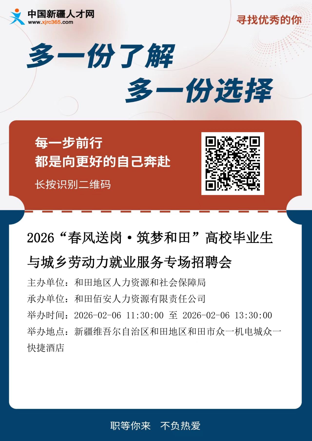 2026“春风送岗·筑梦和田”高校毕业生与城乡劳动力就业服务专场招聘会,邀您共赴春约!